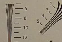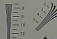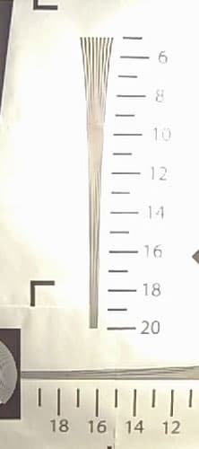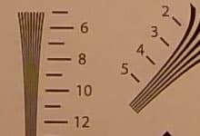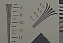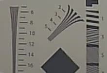 На примере камеры AEE можно видеть практическую бесполезность такого программного зума — деталей вовсе не прибавляется, что и немудрено. А вот GoPro порадовала. Здесь без изменения площади сканирования матрицы, скорее всего, действительно не обошлось, хотя не исключается и очень аккуратный ресайз — на наклонных линиях можно видеть некоторую ступенчатость (что, в свою очередь, можно также объяснить способом снятия информации с матрицы путем пропуска (прореживания) строк). Разрешающая способность GoPro, снимающей в режиме Full HD с минимальным углом обзора, практически равняется аналогичному показателю камеры Wasp. Впрочем, определение разрешающей способности производится несколько иначе — для этого требуется целиком заполнить кадр тестовой таблицей. Таблицы с такими размерами у нас по понятным причинам нет (примерный подсчет показывает, что здесь потребуется «простыня» диагональю в несколько метров), поэтому разрешение камер мы определяем съемкой одного фрагмента таблицы, ключевого. Впоследствии данный фрагмент накладывается в видеоредакторе на таблицу разрешения Full HD, в результате чего и получаются такие результаты: