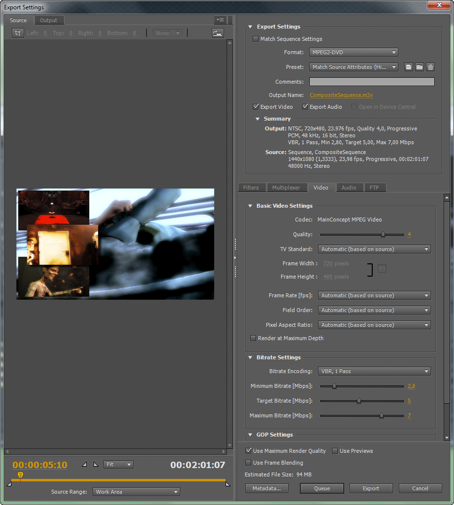 Перейдём к кодированию. К счастью, в новой версии программы Adobe здорово помогла пользователю, неискушённому в хитростях с разрешением, частотой кадров, и прочими интерлейсами. Каждый формат видео, предназначенный для конечного использования (FLV, H.264 Blu-ray, MPEG2 Blu-ray и MPEG2-DVD), теперь имеет несколько чертовски полезную предустановку. Называется она Match Source Attribute, что означает максимально точное соответствие характеристикам оригинала. При выборе такой предустановки кодировщик автоматически подберёт все нужные значения для будущего файла, так, чтобы сохранить исходные частоту кадров, соотношение сторон и т.д.