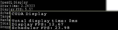 Теперь остаётся лишь наблюдать. Нажатием кнопки Play в окне Monitor запускается воспроизведение таймлинии, при этом технические данные в реальном времени отрисовываются поверх проигрываемой картинки. Заголовки OpenCL Display и CUDA Display обозначают работу программного и аппаратного рендера соответственно.