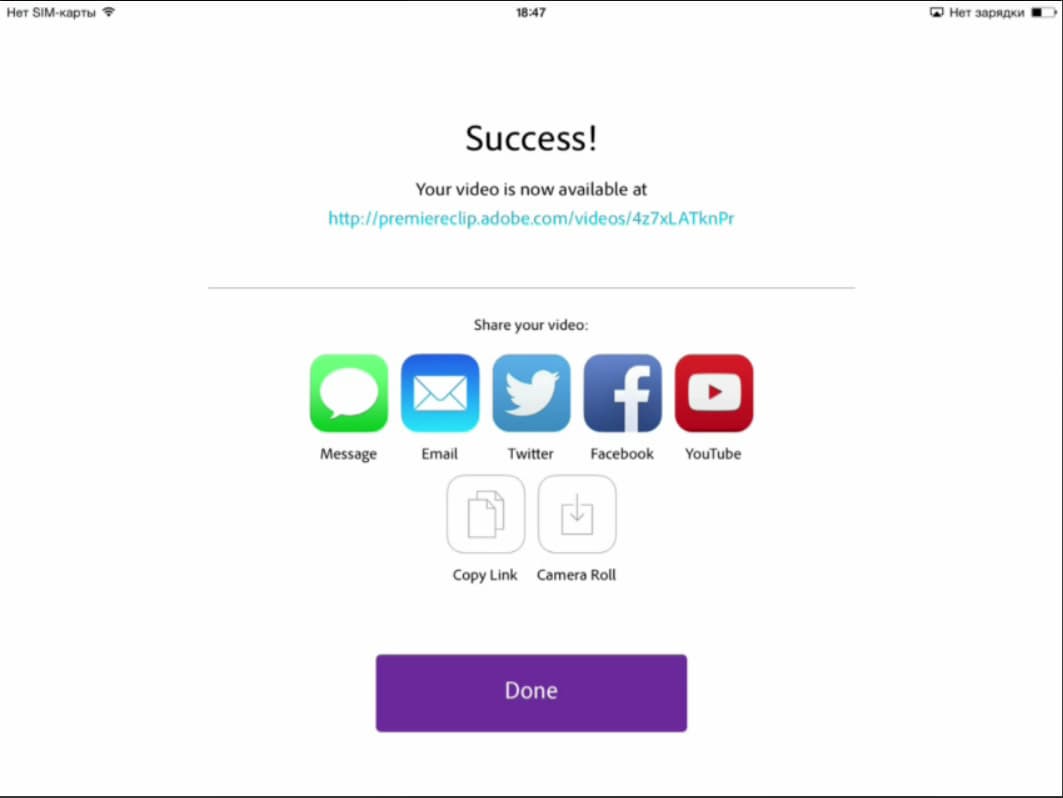 Как и ожидалось, по окончании процесса наш файл сам по себе не появился в памяти планшета. Вместо этого он оказался загруженным на сервер Adobe, а вместо готового видео приложение вывело ссылку для перехода на страничку с клипом. Также здесь предлагается «расшарить» клип в некоторых социальных сетях, либо закачать его в общесистемную папку «Camera Roll».