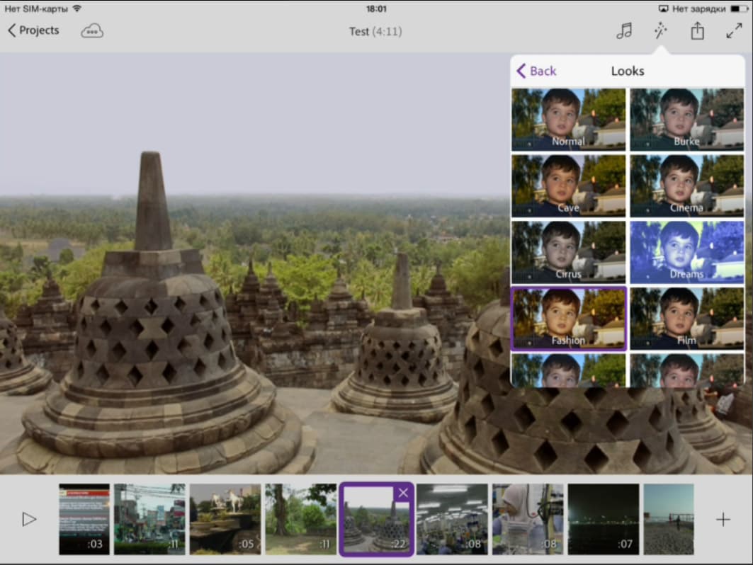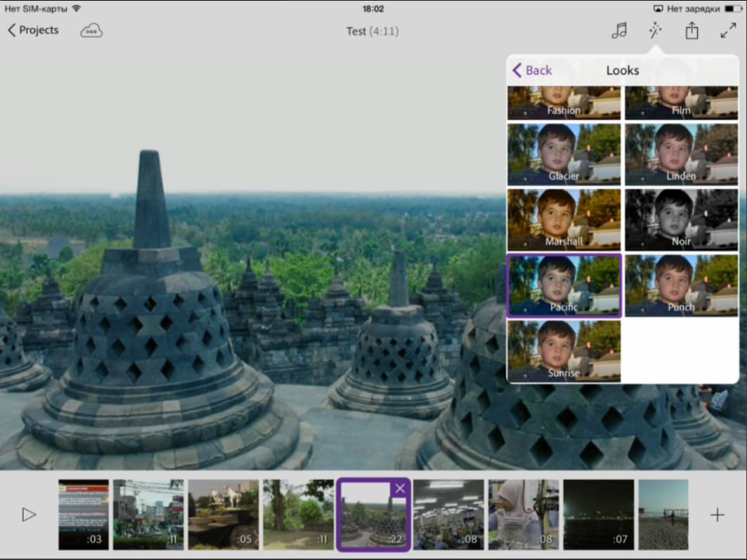Кстати, во время работы стало понятно, почему некоторые импортированные в программу файлы оказались искаженно-зеленого цвета — это видео, в котором отсутствует звук. Помнится, похожие проблемы встречались нам при изучении видеомонтажных программ для системы Android. Приятно видеть что-то общее между этими двумя системами. Правда, в случае с Android такие файлы, не имеющие звуковой дорожки, попросту нельзя было импортировать в видеоредактор. А в iOS данные файлы хоть и импортируются, но выглядят вот так: