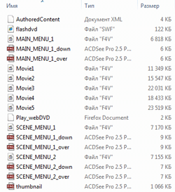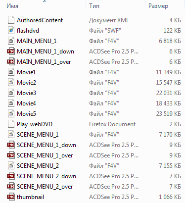 В результате этой довольно долгой работы на жёстком диске в указанной папке создаются файлы html, png, f4v, swf и xml, составляющие содержание получившегося фильма с меню.