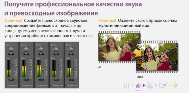 Улучшенный импорт с любительских фотовидеокамер и DSLR (зеркальных фотокамер) | Продвинутый «очиститель» звука, дополнительный видеофильтр |