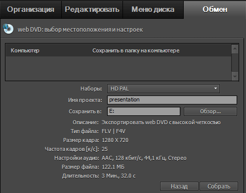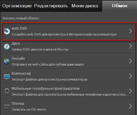 После того, как работа над проектом завершена и меню диска создано, требуется перейти на вкладку Обмен и выбрать самый первый пункт — web DVD.