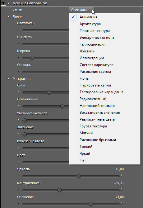 Что касается нового добавленного в программу видеоэффекта с названием NewBlue Cartoonr Plus, то, как видно из названия, он также принадлежит к числу продуктов названной компании NewBlue. Количество настроек и предустановок просто поражает — не поле, но степь для творчества!