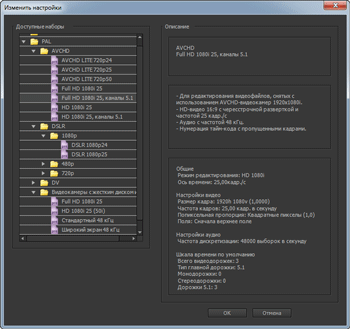 После того, как мы просмотрели видео и отобрали нужные для монтажа клипы, перейдём собственно к монтажу. Итак, Исправление -> Редактирование видео, и Adobe Premiere Elements 9 встречает нас окном, в котором требуется выбрать формат создаваемого проекта. Как видно на скриншоте, программа имеет поддержку всех существующих ныне форматов (за исключением, конечно же, «киношных» 4K).