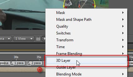 Остались последние штрихи: нужно придать этому компасу "натуральный" вид, словно это прозрачная проекция на лобовом стекле автомобиля. Для начала нужно переместить слой с компасом в трехмерное пространство (разумеется, виртуально). Нажмите правой кнопкой мыши на слое compas/compas и выберите из выпадающего меню команду 3D Layer.