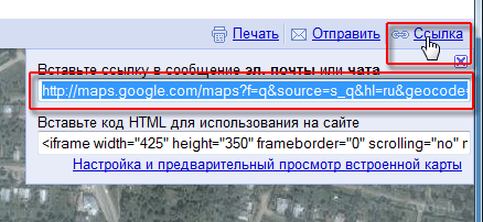 Дальнейшая работа не представляет собой ничего сложного: нужно в привычном браузере настроить оптимальный для вас масштаб отображения карты, и поместить начало маршрута (по которому мы будем двигаться) в удобную точку экрана. Теперь, скопируйте получившийся адрес — нажмите слово Ссылка, и поместите появившуюся выделенную ссылку в буфер обмена. В данной ссылке содержатся не только координаты, но и масштаб отображения — это нам и нужно.