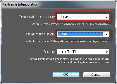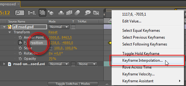 Теперь, один важный момент: щелкните по параметру Position (тем самым все ключевые точки этого параметра на тайм-линии окажутся выделенными). Теперь, нажмите правой кнопкой мыши на любой из выделенных точек и выберите из выпадающего меню команду Keyframe Interpolation.