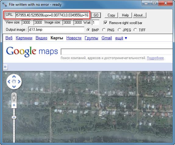 Но не всё так просто: чтобы ваш путь был хоть мало-мальски различимым, необходимо увеличить масштаб отображения карты. Следовательно, таких скриншотов придется сделать... Хм. Много получается. А если путь неблизкий, то их количество выйдет совсем неприемлемым. Но выход есть, он давно известен многим интернетчикам. С помощью бесплатной утилиты url2bmp, известной с незапамятных (по компьютерным меркам) времён, пользователь может "сфотографировать" не только видимую область сайта, но и то, что скрыто за границами окна браузера (в 2007 году разработчиками выпущена новая версия этой утилиты — URL2JPEG).