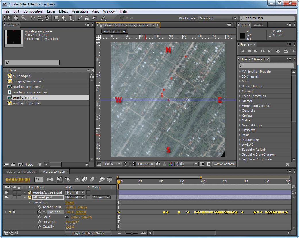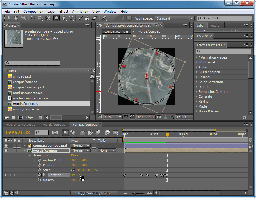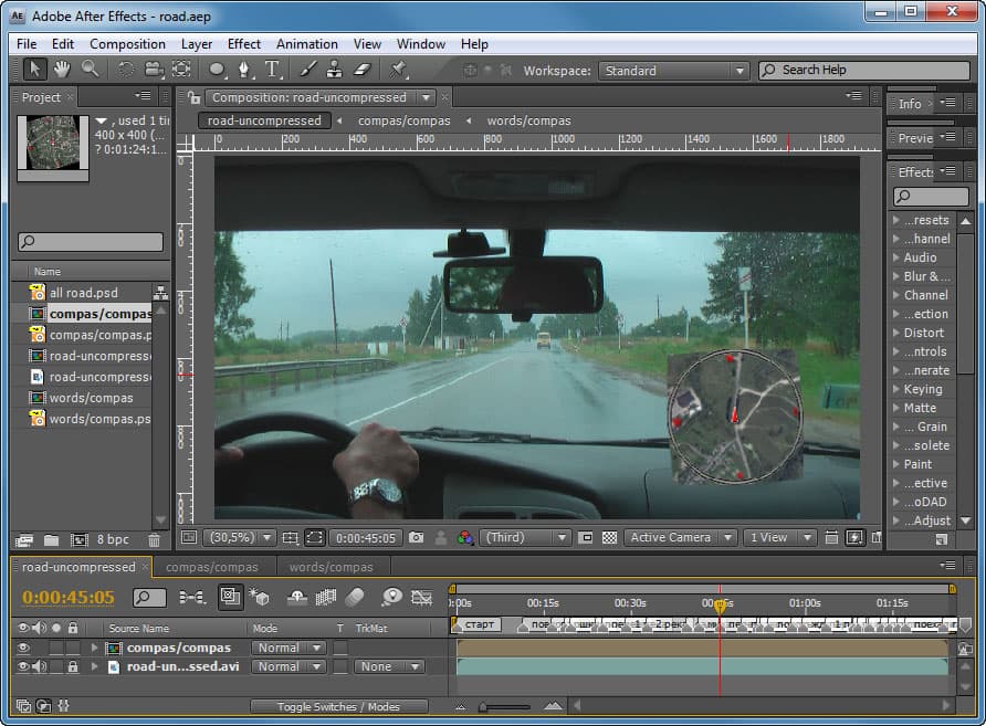 Но ведь при этом и вся карта вместе с надписями должна крутиться! Сделать это можно лишь одним способом: создав ещё одну композицию, окончательную, которая впоследствии и займёт своё место на лобовом стекле автомобиля. Таким образом, получившаяся композиция words/compas это всего лишь заготовка, представляющая собой анимированную карту, передвигающуюся по ключевым точкам (all road.psd), и статичный рисунок компаса поверх этой карты (words/compas.psd).