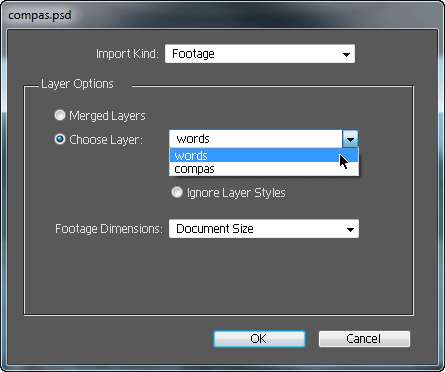 Для начала импортируем в копилку программы весь имеющийся у нас материал. Аккуратнее с файлом compas.psd! Если его просто перетащить из проводника в копилку программы, то оба слоя, из которых состоит компас, сольются в один. Мы не зря старались, разбивали этот объект на два разных слоя. Поэтому придётся импортировать по всем правилам: двойной щелчок в копилке программы, и в диалоговом окне открытия файла выберем нужный. В дополнительном окне появится предложение выбрать нужный слой. Выбираем сначала один, потом второй.
