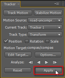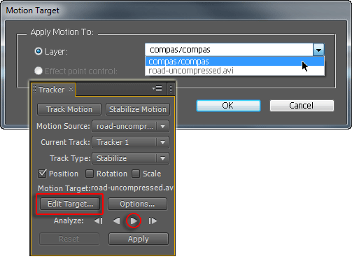 Теперь, необходимо удостовериться, что траектория движения этой фотографии передастся нужному слою: нажмите в окне модуля Tracker кнопку Edit Target, и выберите из выпадающего списка слой compas/compas. Всё готово, запускайте анализ движения соответствующей кнопкой.