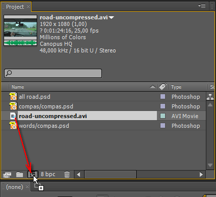 Теперь, когда все необходимое находится в копилке проекта, зацепите мышкой главный видеофайл, и перетащите его на пиктограмму создания новой композиции: