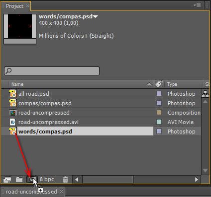 Пройден скучный этап. Пора заняться муторным. Создадим композицию из слоя words/compas.psd, где у нас находятся буквы, обозначающие стороны света (для этого привычно перетащим рисунок words/compas.psd на значок композиции).