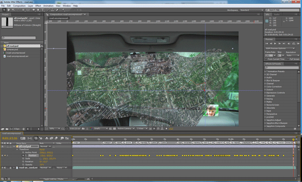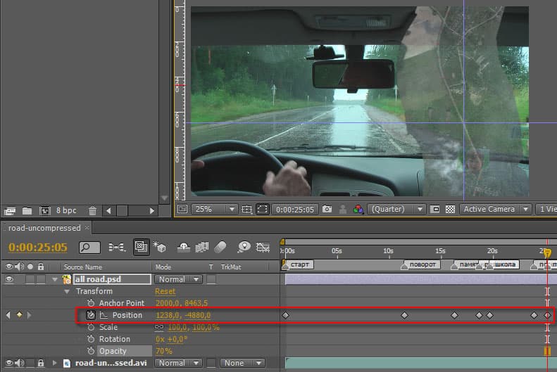 Что делать дальше — вы уже, скорее всего, догадались. Всё верно: нужно анимировать движение слоя с картой, синхронизировав его с, собственно, видеофайлом. Для этого выделите слой all-road.psd и щёлкните по пиктограмме часов параметра Position в контрольной панели слоя на тайм-линии. Теперь, передвигая ползунок времени по тайм-линии и ориентируясь по расставленным заранее маркерам, передвигайте мышкой слой с картой в окне монитора так, чтобы контрольные точки всегда попадали в перекрестие направляющих линий. Каждое перемещение карты будет создавать очередную ключевую точку в параметре Position — эти ключевые точки нам и нужны, только ради их получения мы сейчас проводим всю эту работу.