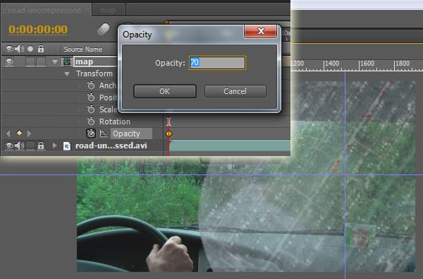 "Проехав" таким образом весь путь, вернитесь в исходную точку и перетащите файл карты на тайм-линию, расположив над видеофайлом (кстати, слой с видеофайлом теперь лучше заблокировать от греха подальше — поставьте замочек в заголовке слоя). Включите отображение линейки в окне монитора (Ctrl+R), и создайте две перекрещивающиеся guidlines (направляющие). Сделать это несложно: просто клацните мышкой по линейке и, не отпуская кнопку, тащите курсор в кадр — вслед за курсором потянется направляющая линия.