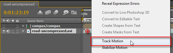 Итак, чтобы приклеить какой-то неподвижный слой (в нашем случае — compas/compas) к движущемуся слою (road-uncompressed.avi), необходимо сначала каким-то образом отследить тряску лобового стекла в кадре, и получить ключевые точки траектории этого движения. Отмотайте ползунок времени в самое начало тайм-линии, и нажмите на слое с видео правой кнопкой мыши. Выберите команду Track Motion — эта команда запускает модуль отслеживания движений в кадре.