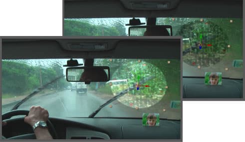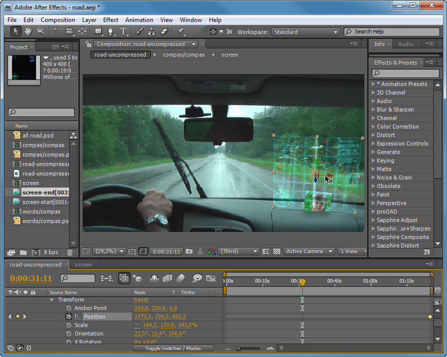 Существуют два пути устранения данной проблемы. Первый — стабилизировать всё видео. Это несложно, и можно сделать непосредственно в After Effects с помощью инструмента Stabilize Motion. Однако при такой стабилизации потеряется главная "вкусность" нашего клипа — эффект присутствия в автомобиле, нахождения на заднем сиденье. Нет, лучше всего, пожалуй, выбрать второй способ: оставить эту пляску камеры (тем самым сохранив ощущения движения на скорости), и постараться совместить тряску с проецируемым изображением так, чтобы при каждом толчке камеры этот компас не швыряло во все стороны по лобовому стеклу, чтобы проекция была приклеена к нему намертво. Это, кстати, сделает проекцию изображения на стекло ещё более реальной; зритель, неискушённый в практике киношных спецэффектов, будет легко обманут, поверив в натуральность происходящего (и наверняка заинтересуется моделью автомобиля).