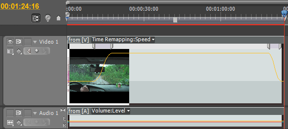 Итак, у нас имеется видео, снятое в движении из автомобиля. В данном примере путь был неблизкий: около 35 километров, и занял почти 45 минут. Само собой, процесс передвижения необходимо ускорить хотя бы до разумных минуты с небольшим! Как это сделать — воля ваша, способов для этого существует предостаточно. В данном примере увеличение скорости воспроизведения производилось в Adobe Premiere Pro CS4 с помощью инструмента Time Remapping. Таким образом, мы добились плавного старта и плавной остановки.