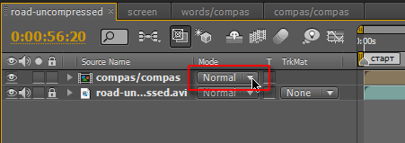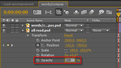 Перейдём в главную композицию road-uncompressed, выделим слой с картой и вырежем его (Ctrl+X). Вернёмся в только что созданную композицию words/compas и вставим вырезанный объект (Ctrl+V). Вернём карте её непрозрачность, восстановив изначальные 100%.