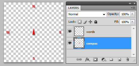 Создадим в графическом редакторе рисунок — внутри этого компаса будет двигаться и вертеться наша карта, отмечающая путь. Сделаем так, чтобы стрелка этого компаса находилась на одном слое (compas), а буквы, обозначающие направление сторон света, — на другом (words).