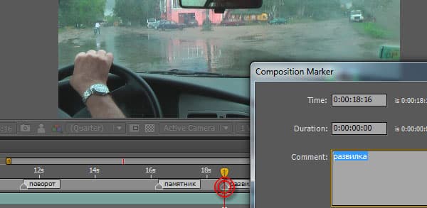 Таким образом, мы создали композицию, имеющую размеры и продолжительность данного видео. При этом видео уже лежит на этой композиции. Поехали? Начинайте передвигать ползунок времени по тайм-линии, и, глядя на экран, вспоминайте свой путь. Останавливайтесь в ключевых точках, и создавайте на тайм-линии маркеры (клавиша * в цифровом блоке клавиатуры). Каждый созданный маркер тут же комментируйте (двойной щелчок по маркеру откроет его свойства, где можно вписать нужные обозначения).