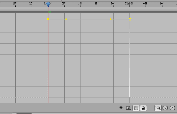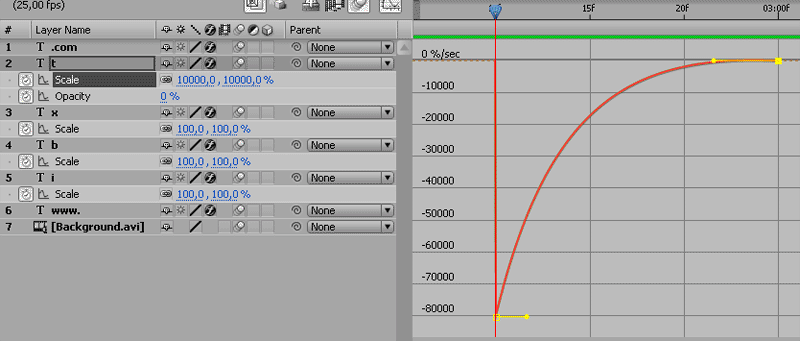 Понятно, что между 2 секунд 10 кадров и 2 секунд 15 кадров наш слой "проявится", то есть его непрозрачность возрастёт с 0 до 100. Теперь настройте кривую изменения масштаба (Scale) данного слоя аналогичным с предыдущими слоями образом.