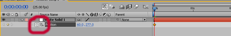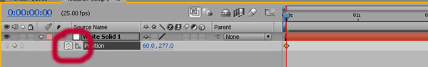 В данном случае значение Position равно 60 по Х и 277 по Y координатам, но у вас оно может быть несколько иным, поскольку двигали мы слой произвольно, курсором, а, не задавая конкретное значение. Наша задача — заставить слой двигаться, то есть анимировать значение Position. Для этого нужно выставить первый ключевой кадр вручную, зафиксировав тем самым Position = 60;277; в нулевом кадре Timeline. Для этого щёлкните по пиктограмме часов рядом с Position.
