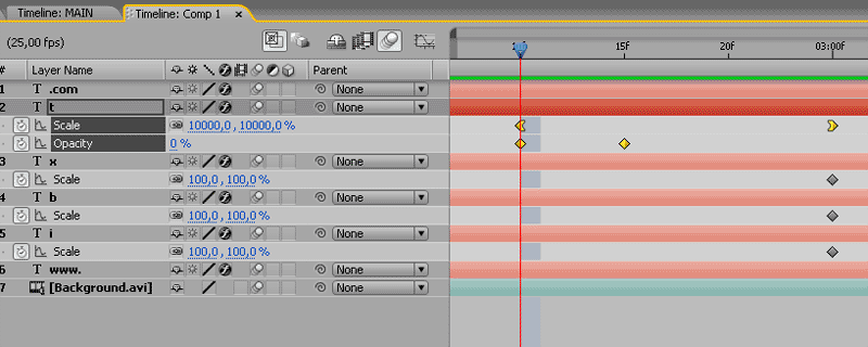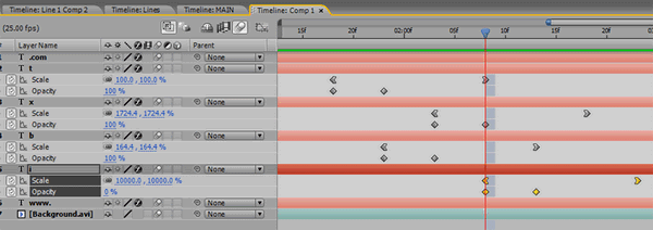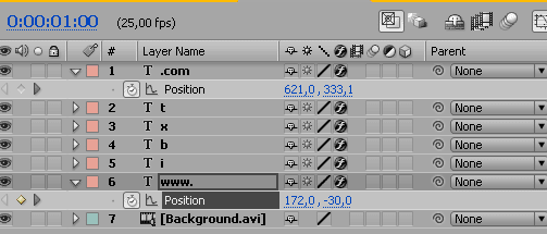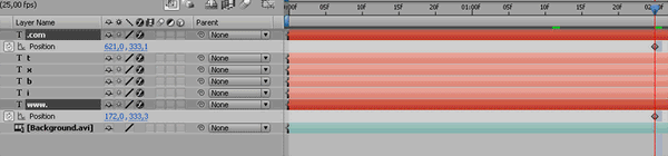 У слоёв "www." и ".com" мы будем анимировать значение Position, поэтому выделите оба этих слоя на Timeline, удерживая Ctrl, и нажмите Р для доступа к значению Position этих слоёв. Переместите CTI на 2-ю секунду таймлинии и щёлкните по пиктограмме часов рядом с Position. На месте CTI появятся ключи значения Position.