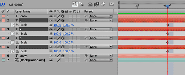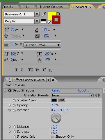Сначала создадим шесть текстовых слоёв "www.", "i", "x", "b", "t", и ".com" в середине композиции, на светлой полосе бэка (background, задний план). Текстовый инструмент вызывается командой Ctrl+T, либо нажатием соответствующей кнопки на панели инструментов. После создания первого слоя нажмите Ctrl+6 тем самым вы получите доступ к панели Character, где регулируются любые параметры текста. Желательно пользоваться направляющими guides для выравнивая наших слоёв, которые работают так же, как в Photoshop. Не забываем следить, чтобы CTI находился на нулевом кадре, случайно не сдвинувшись (не забываем об упомянутой аккуратности).
