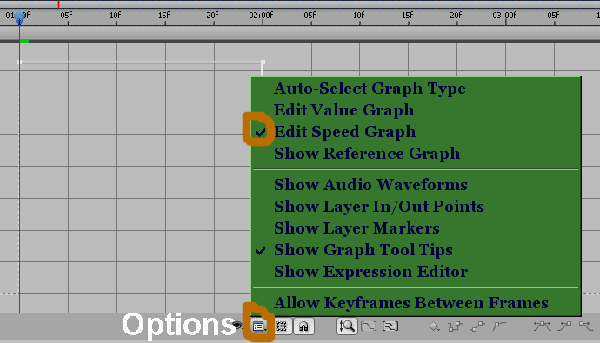 В окне Timeline произошли изменения. Теперь это редактор графов. Белая горизонтальная линия это и есть график нашей линейно изменяющейся скорости, а едва заметные квадраты на концах наши ключи. Graph Editor многофункциональный инструмент, поэтому убедитесь, что отображён именно график скорости, нажав кнопку Options.