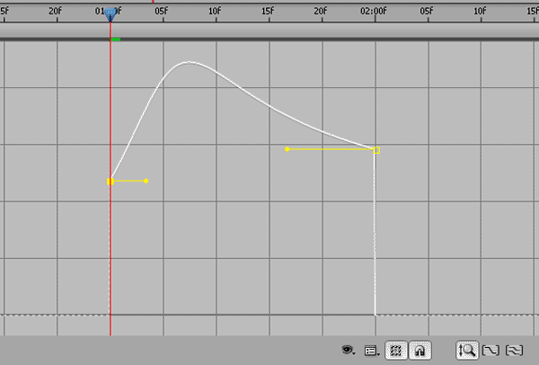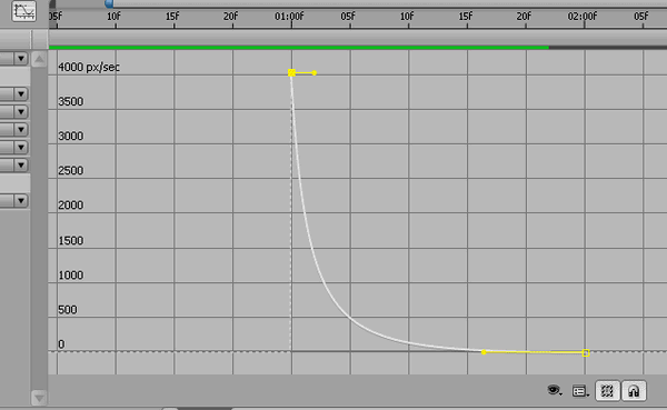 Наша задача — сделать так, чтобы слой как бы "прилетал" на большой скорости, притормаживая в конце до нуля. Думается, несложно представить, как должна выглядеть кривая скорости в этом случае — начинаться на большой величине и заканчиваться на нуле. Таким образом, вам нужно добиться такой формы графа, манипулируя жёлтыми квадратами на концах управляющих векторов. Так же, как шкала Timeline, Graph Editor подчиняется командам клавиатуры + и -, меняя, соответственно, масштаб. Обратите внимание, что слева имеется шкала скорости, которая позволяет понять величину скорости в пикселях в секунду, а главное, понять, где находится нулевая отметка скорости.