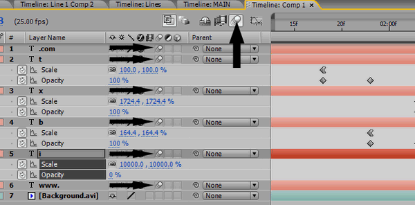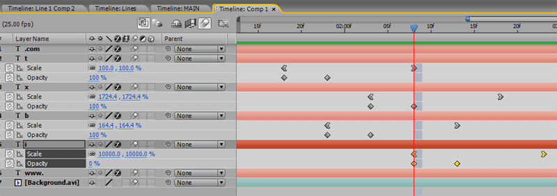 Нажав стандартные Ctrl+C, мы поместим данные о параметрах выделенных ключей в буфер обмена. Далее, выделяем слои, куда бы мы хотели вставить скопированные ключевые кадры (в данном случае это слои "i", "x", "b"), и жмём Ctrl+V. Обратите внимание, что ключи вставляются по времени туда, где находится CTI, а не повторяют позицию скопированных ключей. То есть необходимо перед вставкой убедиться, что CTI находится на той отметке, где нужно, в данном случае — на 2 секунды 10 кадров шкалы времени. Автоматически новые ключи отображаться не будут, чтобы их увидеть, необходимо нажать U — данная команда делает видимыми все ключевые кадры у выделенного слоя (слоёв). А команда UU раскроет все параметры, которые менялись у выделенного слоя, пусть даже без создания ключей. В процессе работы можно будет оценить, насколько это удобно.