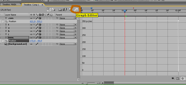 А теперь - самое главное. В реальной жизни любое движение начинается с нулевой скорости и ей заканчивается. И пренебрежение этим правилом в композитинге, во-первых, — крайне непрофессионально, а во-вторых, в корне меняет визуальное восприятие картинки. Разумеется, всё зависит от задач, но это общее правило, и об этом надо помнить. По крайней мере, останавливаться объект должен с постепенным замедлением до нуля. В АЕ есть прекрасный инструмент для этого — Graph Editor. Выделите значение Position слоя "www.", щёлкнув на названии параметра, и нажмите кнопку Graph Editor.