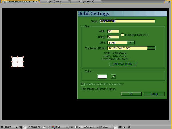 Итак, анимация (безотносительно к конкретному приложению) — это изменение параметра во времени. Параметра абсолютно любого — например, координат значения Position для перемещающегося в кадре объекта, или величин параметров фильтра Levels при попытке сгладить изменяющиеся во время съёмки условия экспозиции. В подавляющем большинстве случаев действие анимации основано на ключевых кадрах — то есть фиксированных значениях параметра в обозначенной точке времени. Рассмотрим это на простом примере. Откройте АЕ, создайте новую композицию (Ctrl+N) PAL D1/D,10 секунд, и в ней — новый слой (Ctrl+Y), 50 на 50 пикселей. Отодвиньте его с помощью инструмента Selections Tool(V) (он по умолчанию включен для курсора при открытии АЕ) к левому краю экрана.