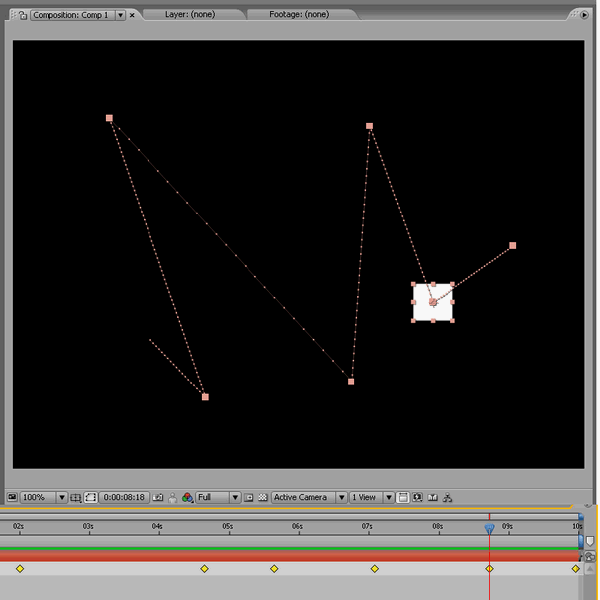 Вы изменили значение Position в 250-м кадре композиции. Таким образом, в промежутке времени от 0 до 250-кадра Position будет изменяться от 60;277 до 630;277 (в данном случае), заставляя слой перемещаться. Убедитесь в этом, нажав Num0 и просмотрев превью. Обратите внимание — в 250 кадре на тайм-линии новый ромб — ключевой кадр на нашем слое появился автоматически. Это общее правило — один ключевой кадр (не обязательно первый) нужно поставить вручную, а все остальные АЕ будет формировать автоматически при любом изменении анимируемого параметра. Переместите CTI поочерёдно в произвольные отметки времени в пределах композиции и изменяйте всякий раз положение слоя — вы увидите новые ключевые кадры, а траектория движения слоя изменится сообразно тому, в какие координатные точки вы перемещали слой.