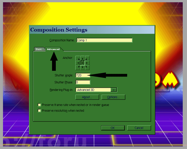 Нажмите Num0 и просмотрите результат. Отключив главную кнопку MB для всей композиции, почувствуйте, что называется, разницу в визуальном восприятии картинки с MB и без него. Величина смаза регулируется значением параметра Shutter Angel, на вкладке Advanсed окна Compositions Settings, вызываемом командой Ctri+K, либо через соответствующий пункт меню Composition. Соответственно, чем больше Shutter Angel (макс. значение = 720), тем сильнее будут размываться объекты. По умолчанию стоит 90, поэтому это значение можно смело увеличивать до 360-ти или 720-ти, ибо, по мнению автора, случаи, когда MB может оказаться много, встречаются крайне редко.