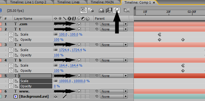 Выделите остальные текстовые слои, нажмите S, чтобы получить доступ к параметру Scale, и поставьте ключи на 3-й секунде Timeline — у этих слоёв мы будем анимировать размер.