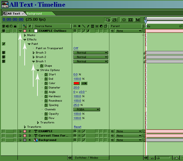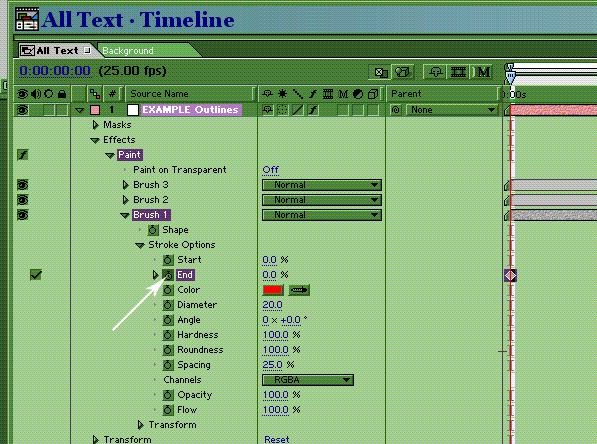 В дальнейшем число штрихов и, соответственно, вложенных слоёв Brush1, 2, 3… в данной композиции достигнет 14, и чтобы совершенно в них не запутаться, можно анимировать их по мере закрашивания каждой буквы. Итак, чтобы добиться «прорисовки» штрихов нужно анимировать параметр «End» в группе Stroke Options на Timeline. Для этого щёлкните последовательно на соответствующих треугольниках на Timeline.
