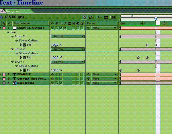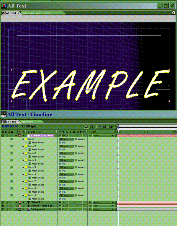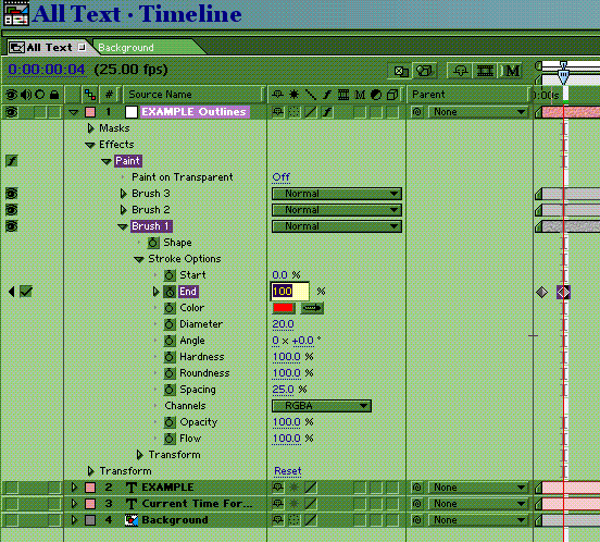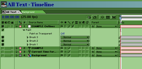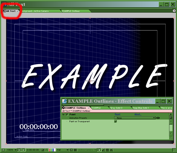 Данным инструментом нельзя воспользоваться непосредственно в окне композиции, - он действует только в окне слоя. Поэтому создаётся дополнительный слой, на котором будет производиться рисование. Для этих целей выделите на Timeline текстовый слой «EXAMPLE» и выполните команду главного меню Layer>Create Outlines. Образовался новый слой (Solid) белого цвета с масками, контуры которых в точности повторяют контуры надписи, который так и называется – EXAMPLE Outlines.