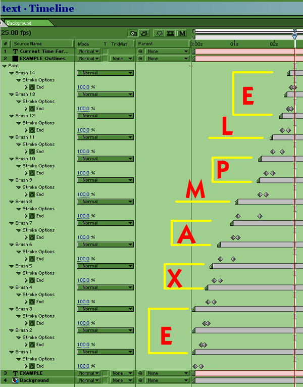 Таким образом, в промежутке между 0-ым и 8-ым кадром прорисуются все три штриха буквы «Е», обеспечивая в дальнейшем «написание» самой буквы. Далее следует повторить рисование и анимирование штрихов для всех букв слова Example. Должна получиться такая картина.