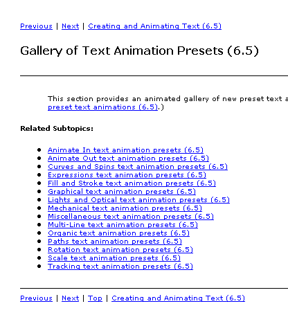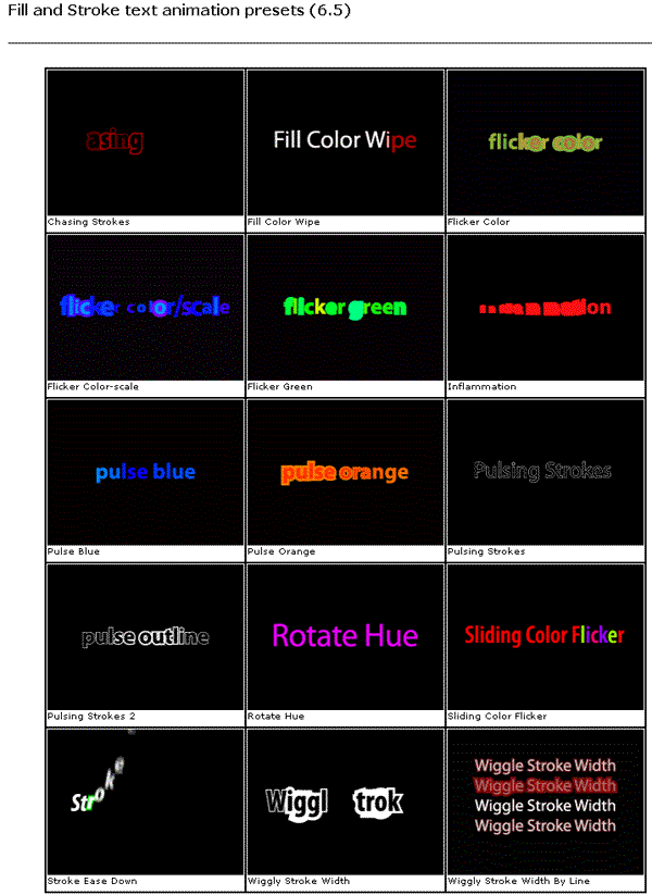 Далее следует выбрать любой из представленных разделов. Вашему вниманию будет предоставлена таблица из AnimatedGIF изображений с названиями каждого пресета, где можно визуально ознакомиться с той или иной анимацией текста.