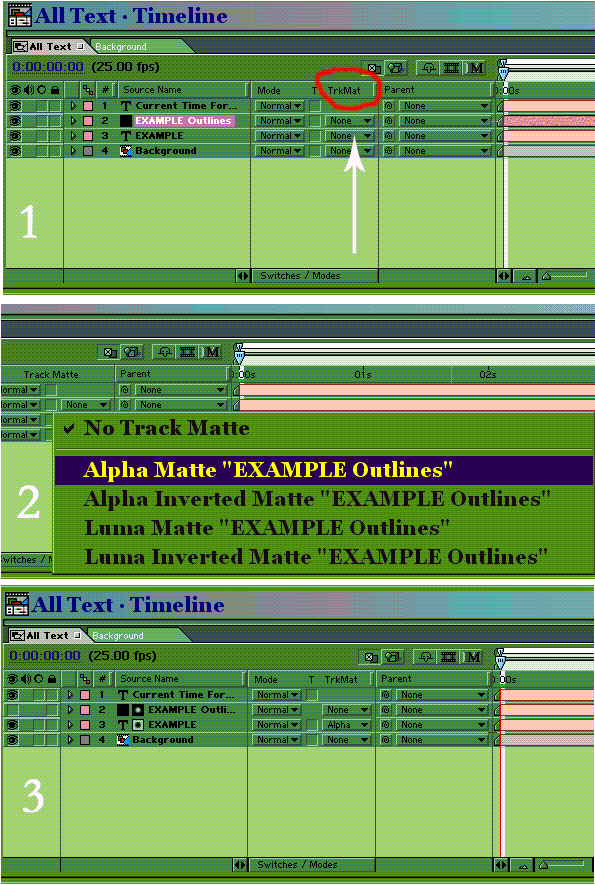 Теперь нужно использовать слой со штрихами в качестве Track Matte (движущейся маски) для текстового слоя Example.
