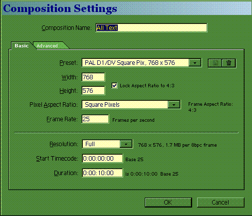 Вместе с версией 6.5 поставляются библиотеки предустановок для анимации текста. Существующую теперь возможность использования готовых анимаций сложно переоценить, поскольку раньше текст приходилось анимировать «вручную» и на повторение отдельных пресетов, содержащихся в библиотеке уходило очень много времени, а исполнение некоторых было вовсе невозможно без знания алгоритмических выражений. Рассмотрим на практике, как можно использовать предустановки анимаций текста. Создайте проект и, нажав Ctrl+N, новую композицию со следующими настройками: