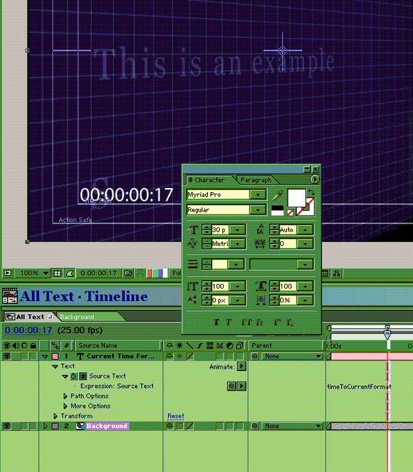 Теперь отмените применение последней анимации или удалите слой и создайте новый. Примените к нему пресет Current Time Format из директории Expressions. Обратите внимание, что в этом случае не важно, какой именно текст содержался в слое. Этот пресет построен на основе алгоритмического выражения (Expression), формирующего текстовые символы (цифры) в зависимости от положения линия редактирования и визуализирует, так сказать, текущее положение последней. В палитре Characters поставьте размер текста, равный 30 и поместите сам текст в левый нижний угол изображения.