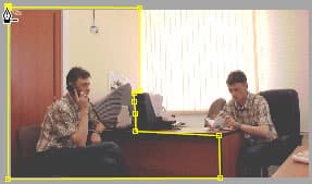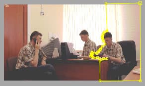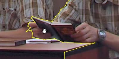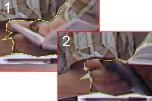 Здесь мы впервые сталкиваемся с серьезной проблемой: человек, сидящий в правой части кадра и делающий записи, постоянно шевелится, ворочая книгой и поигрывая авторучкой. А в некоторые моменты он своими движения даже перекрывает фигуру человека, сидящего за компьютером, а ведь тот, в свою очередь, также двигается! Что поделать, придется рисовать маску, у которой будет большое количество вершин, помогающих наиболее точно отсечь лишнее. Конечно, для такой тонкой работы придется постоянно увеличивать/уменьшать масштаб отображения картинки в окне Composition и перемещаться в разные места кадра. Здесь окажется удобным изменение значения масштаба простым вращением колеса мышки. Если нажать и удерживать клавишу Space (пробел), то курсор временно превратится в пиктограмму руки — теперь, пока пробел нажат, двигайте картинку в любую сторону. Через несколько минут такой работы вы наверняка приобретете необходимую сноровку, и перестанете задумываться, как бы вам добраться до невидимой части кадра, чтобы продолжить рисование маски.