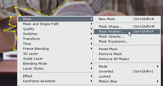 Все-таки не совсем естественно выглядит эта граница, создаваемая маской — слишком она резкая. При последующем просмотре на экране хорошей диагонали такая мелочь обязательно даст о себе знать, предательски выявив факт подлога. Вывод — необходимо сгладить эту резкую границу, смягчить переход между совмещаемыми областями. Для этого нажмите правой кнопкой мыши на маске, и выберите из выпадающего меню пункт Mask -> Mask Feather.
