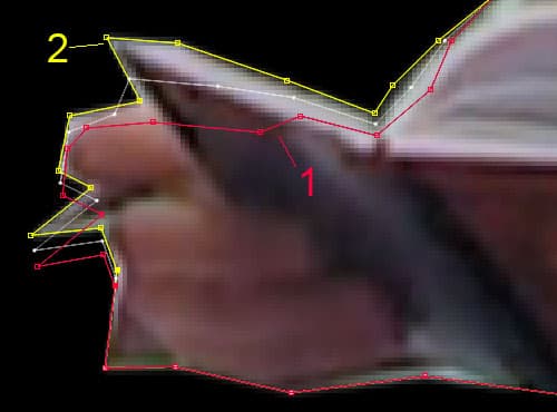 Не перепутайте вершины местами: если одна из вершин раньше находилась в районе сгиба записной книжки, то пусть она так и следует за этим сгибом, словно приклеенная. На рисунке далее виден результат такого перемещения вершин: маска красного цвета — исходная, желтого — конечная. Находящаяся посредине ломаная кривая белого цвета — получившийся промежуточный результат трансформации маски, здесь он приведен для наглядности.