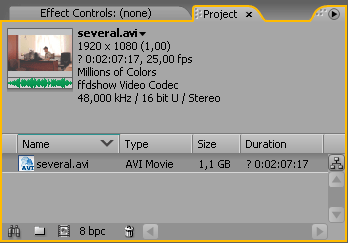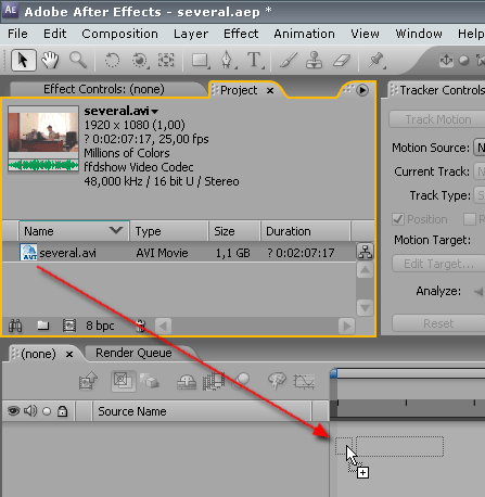 Как видно на рисунке выше, копилка пуста, за исключением только что импортированного файла. Опять же — не страшно. Необязательно вручную создавать новую композицию, стараясь «попасть в точку» — соблюсти нужную продолжительность композиции, размеры и соотношение сторон кадра, их частоту... Программа автоматически создаст композицию с точно отвечающими импортированному видеофайлу параметрами, стоит лишь перетащить его из копилки проекта и бросить на таймлинию.